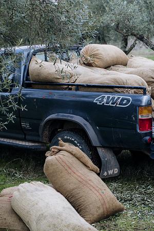 Sacks overflow a pick-up truck after a long day of olive harvesting.